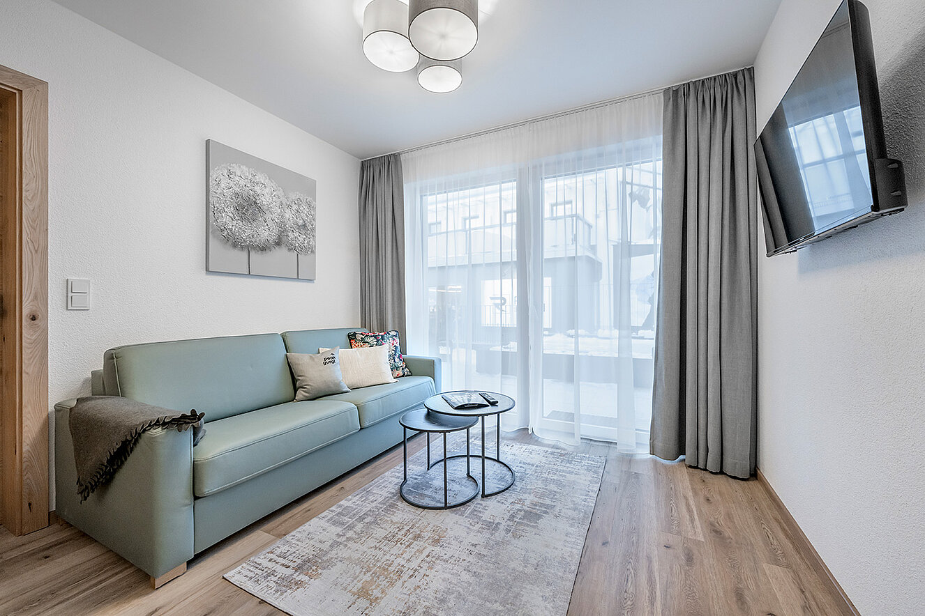 - Wohnzimmer mit komfortabler Auszieh-Couch (zusätzliche Schlafmöglichkeit) und TV