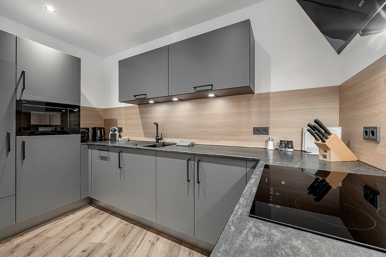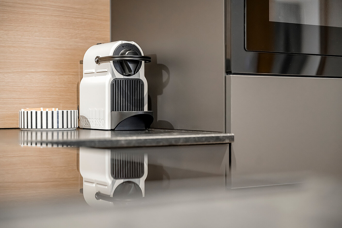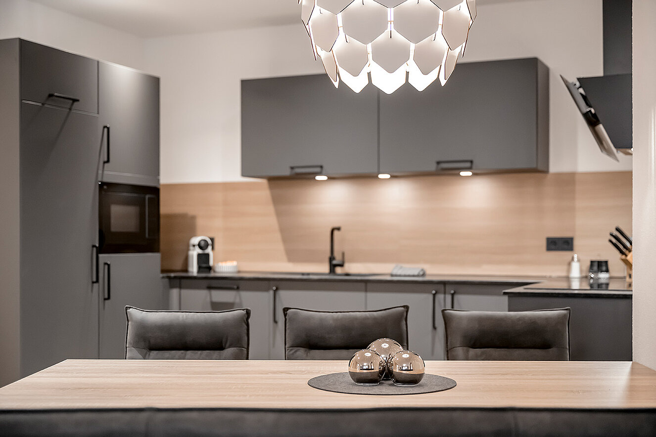 - Voll ausgestattete Wohnküche mit Esstisch, Mikrowelle, Kaffeekapselmaschine, Geschirrspüler, Herd, Kühlschrank, Wasserkocher und kompletter Geschirr- und Kochausstattung
