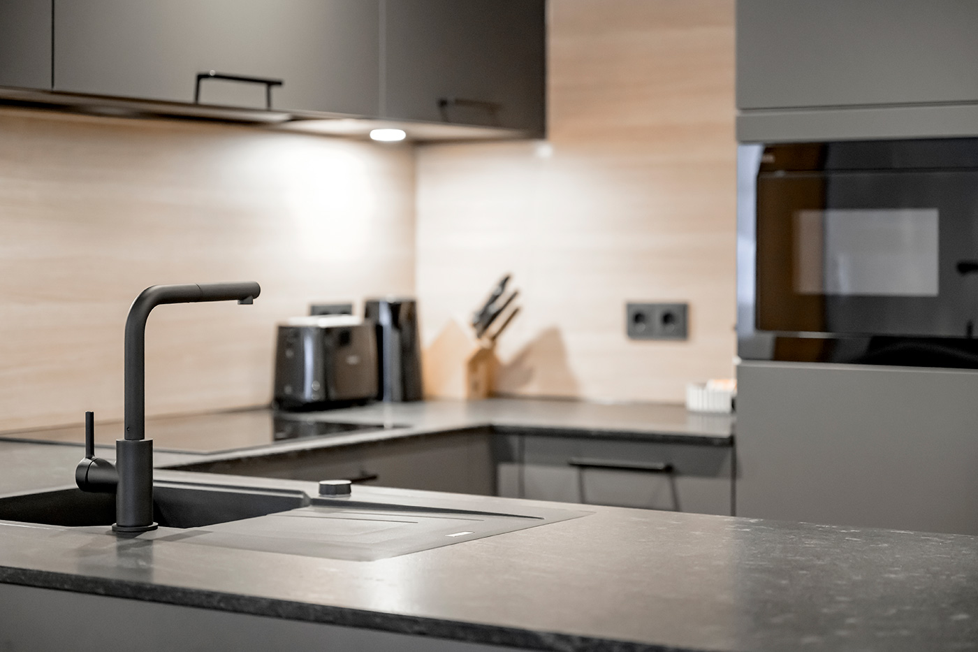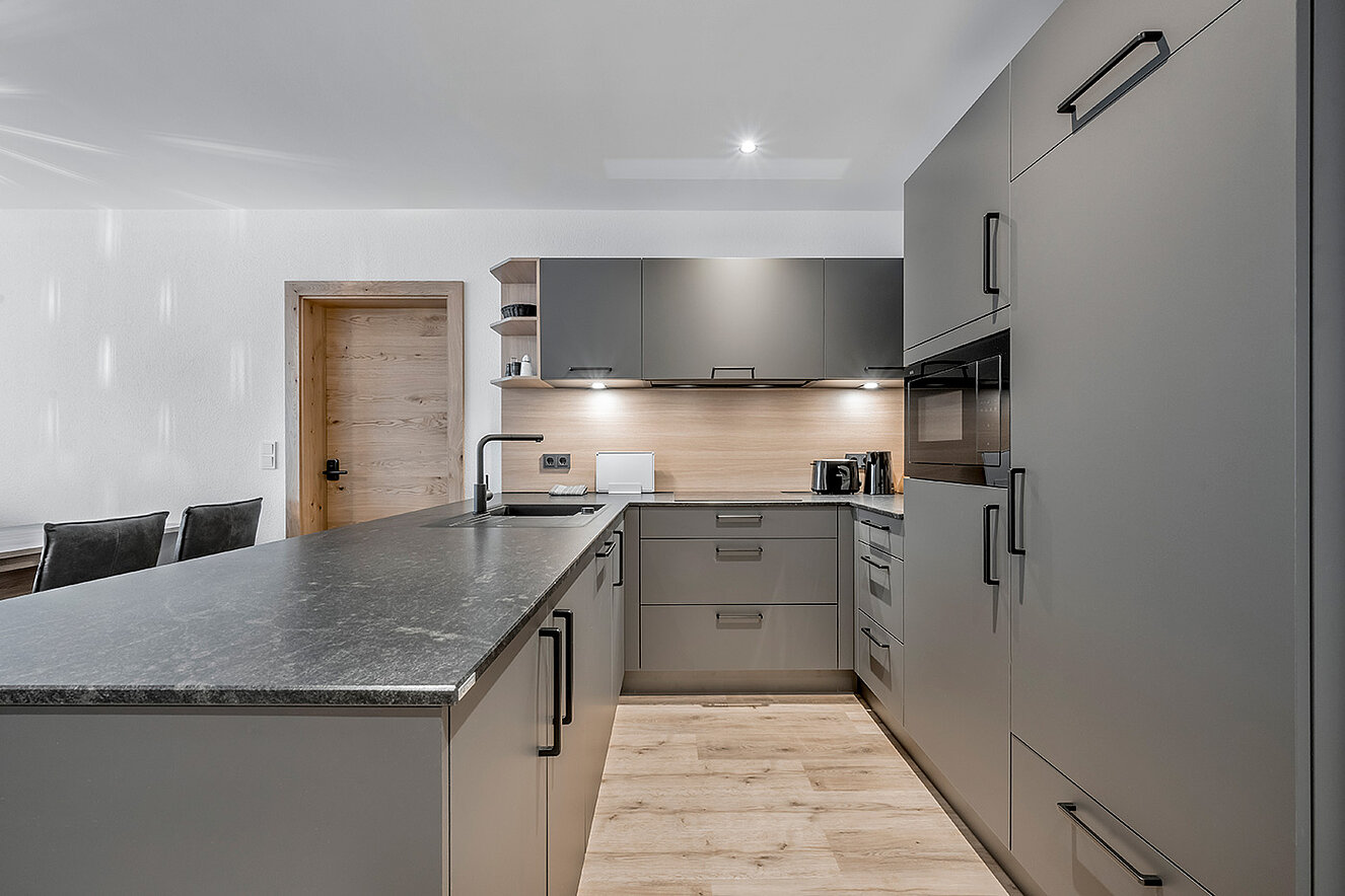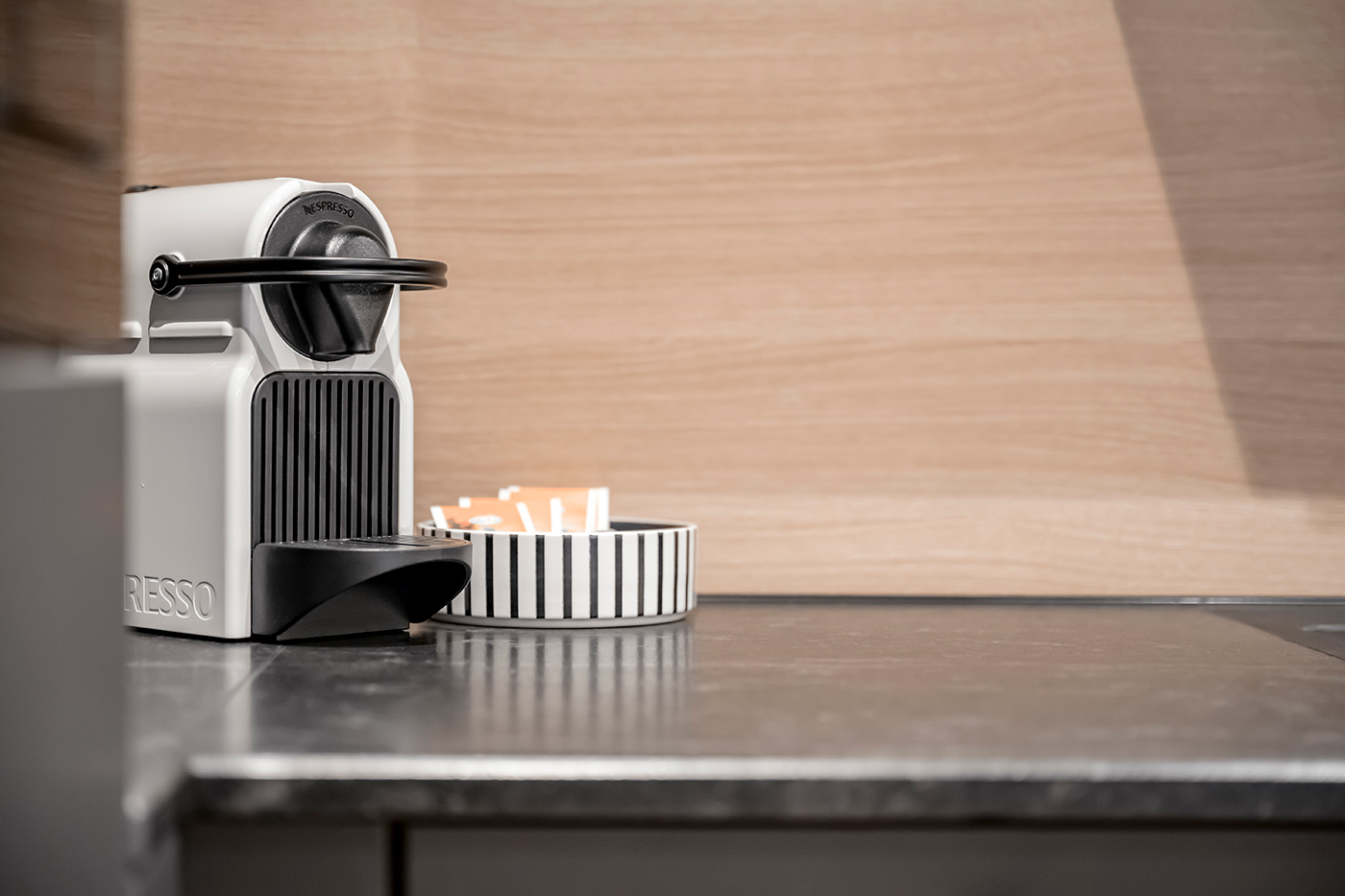 - Voll ausgestattete Wohnküche mit Esstisch, Mikrowelle, Kaffeekapselmaschine, Geschirrspüler, Herd, Kühlschrank, Wasserkocher und kompletter Geschirr- und Kochausstattung